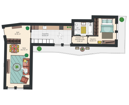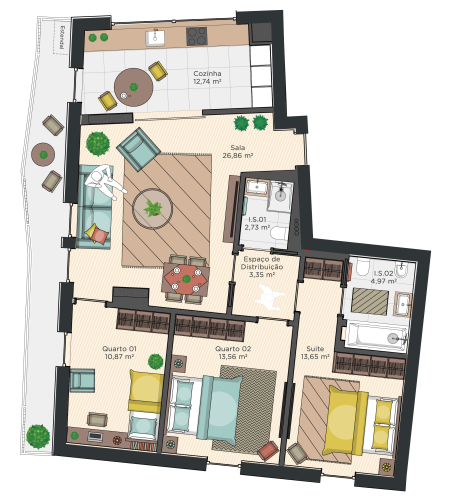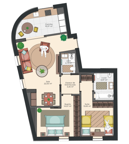Cozinhas totalmente equipadas com eletrodomésticos BOSH, marca reconhecida pela robustez e qualidade: Frigorífico, Fogão com placa de indução, Forno Micro- ondas, Máquina de lavar loiça, Máquina de lavar e secar roupa, Esquentador e Exaustor.