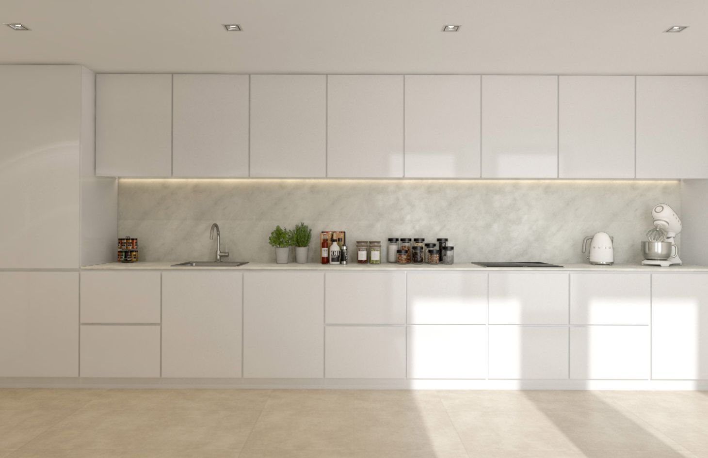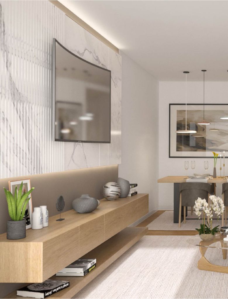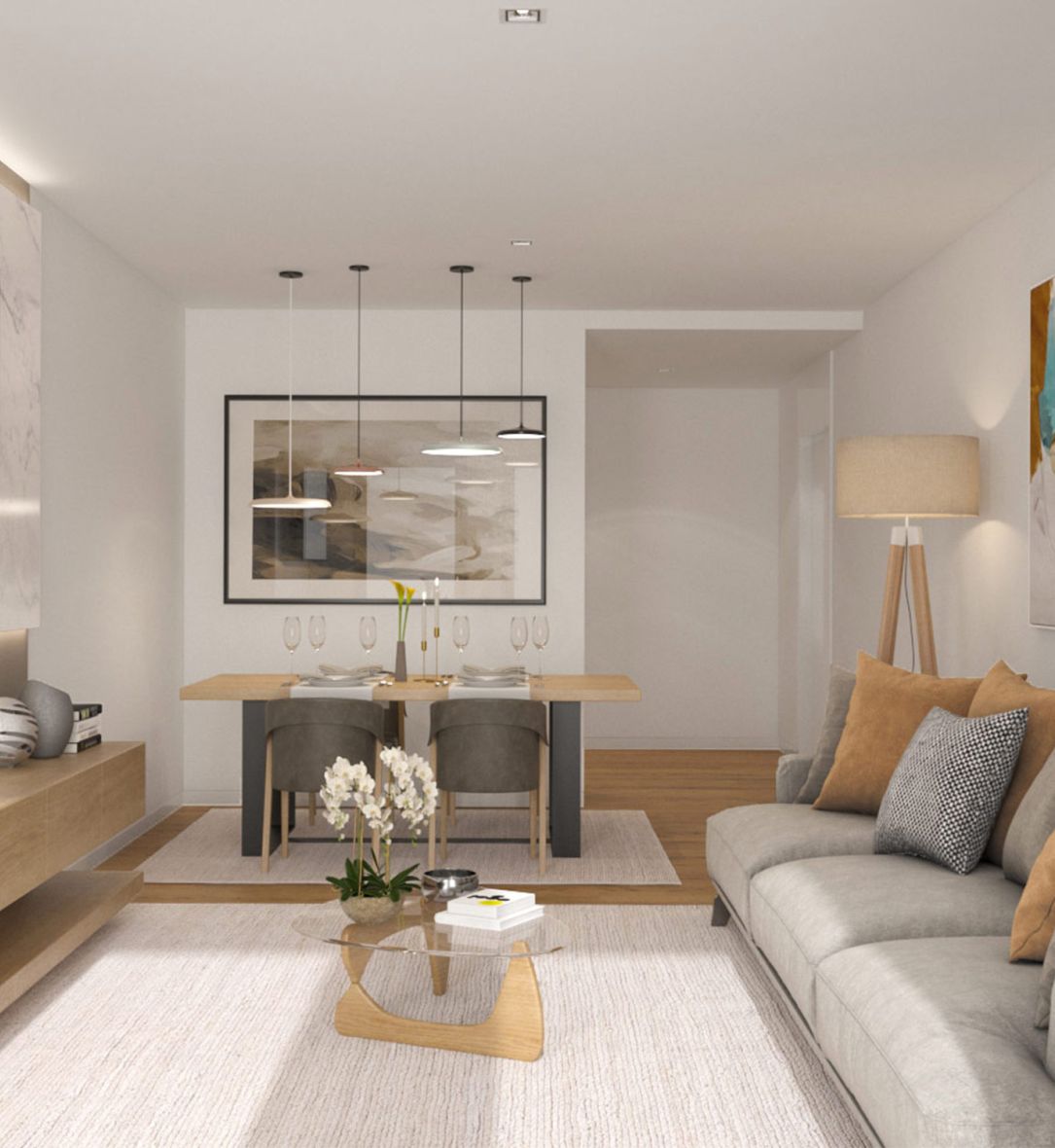 Uma combinação de materiais e soluções que resultam num ambiente agradável, luminoso e moderno.